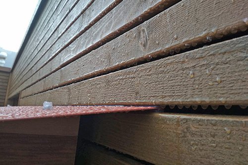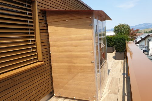 Überzeugt haben vor allem der Wirkungsunterschied und das komfortable Liegen in der Kabine. Die Kabine sollte auf der grosszügigen und offenen Terrasse der Attikawohnung aufgestellt werden. Unsere Kompetenz, Kabinen lückenlos vor dem Wetter zu schützen, hat Herrn und Frau Ostertag dann vollends überzeugt. Denn die ALLWASPA Kabinen sind als einzige in der Schweiz für den Aussenbereich konstruiert, brauchen jedoch einen Wetterschutz. Wie man auf den Fotos sehen kann, greift das Wetter von allen Seiten auf die Kabine, ausgenommen der Rückseite. Wir schlugen dem Ehepaar einen Vollschutz vor: ein Dach aus stabilem Stahlblech, farblich angepasst an die Holzleisten und auf allen drei Seiten ein optisch leichtes Plexiglas. So konnten wir einen vollständigen Schutz mit leichter Optik vereinen.