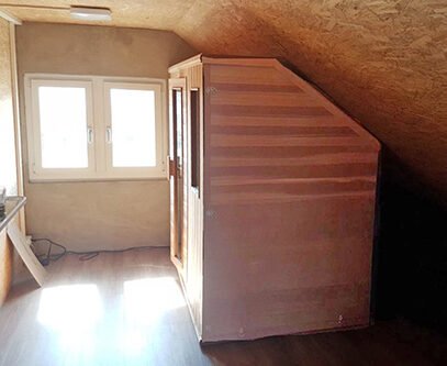 Unser Kunde Krieg hat im Dachgeschoss einen idealen Platz für seine neue Infrarotkabine AL 210 gefunden. Herr Krieg hat dieses bequeme Modell gewählt, weil er und seine Frau gerne liegen, denn dies ist entspannender. Sehr wichtig war für Herrn Krieg auch, dass die Liegefläche flexibel ist. Denn er und seine Frau bevorzugen unterschiedliche Liegepositionen.