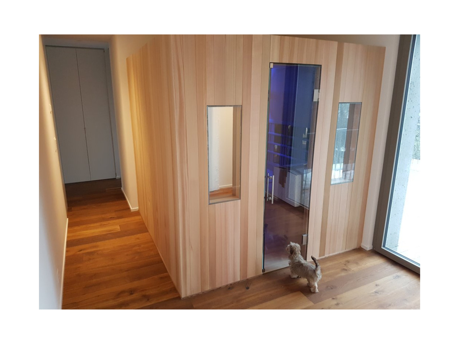 Die Kabine auf Mass fügt sich wie angegossen in die Architektur ein und die Strahler werden so ausgerichtet, dass man in der gesamten Kabine die volle Infrarot-Wirkung hat.